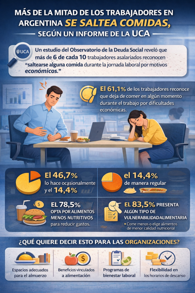 Un informe reciente del Observatorio de la Deuda Social de la Universidad Católica Argentina (UCA) encendió una señal de alerta sobre una realidad que atraviesa a gran parte del mundo laboral en Argentina: el 83,5% de los trabajadores asalariados presenta algún tipo de vulnerabilidad alimentaria durante su jornada laboral.