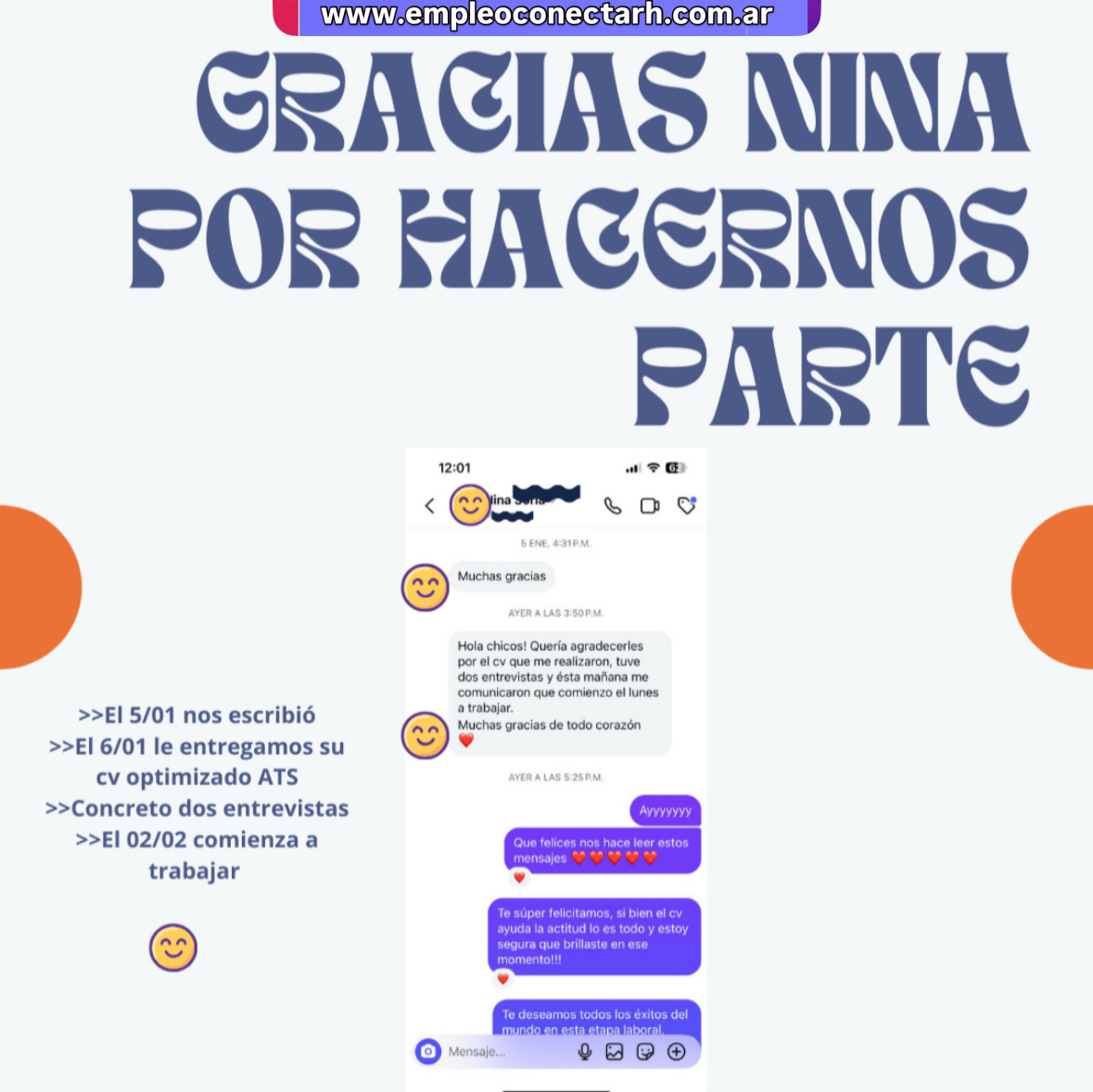 📩 Todo empezó con un mensaje real:“Mandé mi CV y no me llamaban”. Así llegó Nina a ConectaRH, con frustración, dudas y muchas ganas de cambiar su situación laboral. Desde la mirada profesional de la Lic. Mayra Padilla Segovia, entendimos de inmediato que el problema no era su experiencia, sino cómo estaba comunicando su perfil en el mercado laboral actual de San Juan. 🛠️ Optimización de CV profesional: el primer paso al empleo El 5 de enero Nina nos escribió. El 6/01 ya tenía su CV optimizado con formato ATS (Applicant Tracking System), clave para superar los filtros automáticos de las empresas y mejorar las oportunidades de entrevistas laborales. Desde ConectaRH trabajamos sobre: ✔️ Palabras clave del rubro✔️ Logros medibles y resultados concretos✔️ Diseño claro, moderno y profesional✔️ Habilidades blandas alineadas al puesto Como explica la Lic. Mayra Padilla, “un CV no es solo un documento: es una herramienta estratégica de posicionamiento laboral”. 💥 Resultados rápidos: entrevistas en pocos días Con su nuevo CV, Nina comenzó a recibir respuestas en menos de una semana. En pocos días concretó dos entrevistas laborales, algo que no lograba desde hacía meses. El cambio no fue casual: fue producto de una estrategia clara, ética y personalizada. 🎉 Nuevo trabajo en San Juan: objetivo cumplido El 2 de febrero, Nina comienza su nuevo empleo. Su mensaje nos emocionó: “Gracias por hacerme parte”. Para el equipo de ConectaRH y la Lic. Mayra Padilla Segovia, estas historias confirman que cuando una persona cuenta bien su valor profesional, las oportunidades aparecen. 🧠 Por qué esta historia importa Porque refleja lo que viven miles de personas en San Juan:➡️ Envían CVs y no reciben respuestas.➡️ Dudan de su perfil, cuando en realidad el problema es la forma de presentarlo. Como sostiene la Lic. Mayra Padilla: “Con orientación profesional, claridad y honestidad, el talento siempre encuentra su lugar”. 💡 Tips clave para que tu CV genere entrevistas laborales ✅ Adaptalo al puesto y al rubro✅ Incluí logros concretos y medibles✅ Usá formato ATS✅ Mostrá tus habilidades blandas✅ Transmití claridad, foco y motivación 📲 ¿Tu CV no está funcionando? Si estás en San Juan y sentís que tu currículum no genera entrevistas, escribinos. En ConectaRH, junto a la Lic. Mayra Padilla Segovia, acompañamos procesos laborales con ética, estrategia y compromiso humano. ✅ Conclusión La historia de Nina demuestra que no se trata de enviar más CVs, sino de enviar mejores CVs. Desde ConectaRH creemos —y lo comprobamos todos los días— que cuando una persona aprende a comunicar su valor con claridad y honestidad, el mercado responde. Y ahí, el trabajo deja de ser una búsqueda frustrante para convertirse en una oportunidad real.