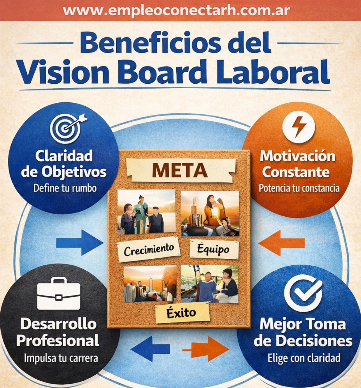 Por ConectaRH – Lic. Mayra Padilla Segovia En ConectaRH trabajamos todos los días con personas que no solo buscan un empleo, sino un proyecto de vida laboral con sentido, estabilidad emocional y crecimiento profesional. Y ahí aparece una herramienta simple, creativa y profundamente transformadora: el Vision Board laboral. No se trata de pegar imágenes lindas en una cartulina.Se trata de ordenar tu rumbo profesional, alinear tus decisiones con tus valores y transformar deseos difusos en objetivos concretos. Desde la mirada de Recursos Humanos, un vision board bien construido es una herramienta de empleabilidad, motivación, autoliderazgo y bienestar laboral. ¿Qué es un Vision Board laboral? Un Vision Board laboral es un tablero visual donde representás tus metas profesionales, aspiraciones, valores y objetivos usando imágenes, palabras, símbolos y frases que conectan con lo que querés lograr en tu carrera. En el mundo del trabajo, se transforma en una verdadera herramienta de gestión de carrera, porque: ✔ Te ayuda a clarificar hacia dónde querés ir✔ Te mantiene enfocado en tus objetivos profesionales✔ Refuerza tu motivación diaria✔ Conecta tus acciones con tu propósito laboral✔ Te permite diseñar tu futuro en lugar de improvisarlo Como sostiene la Lic. Mayra Padilla Segovia, directora de ConectaRH: “Cuando una persona visualiza su futuro laboral, empieza a tomar mejores decisiones en el presente.” ¿Por qué Recursos Humanos recomienda usar Vision Board en el trabajo? Desde RRHH vemos a diario personas capacitadas, talentosas y responsables que se sienten estancadas, frustradas o desconectadas de su trabajo. No por falta de habilidades, sino por falta de claridad profesional. El vision board laboral ayuda a: 🔹 Clarificar objetivos profesionales Transforma el “quiero algo mejor” en metas reales, alcanzables y medibles. 🔹 Aumentar la motivación y el compromiso Tener visible lo que querés lograr fortalece la constancia, el foco y la perseverancia. 🔹 Desarrollar autoconocimiento Obliga a preguntarte qué querés, qué disfrutás, qué no querés repetir y qué tipo de entorno laboral necesitás. 🔹 Mejorar la toma de decisiones laborales Te ayuda a decir sí o no a oportunidades según si te acercan o te alejan de tu visión profesional. 🔹 Potenciar la empleabilidad Quien tiene claro su rumbo, se prepara mejor, se postula mejor y se posiciona mejor en el mercado laboral. Cómo crear tu Vision Board laboral paso a paso 🧭 1. Definí tu norte profesional Preguntate con honestidad: 🎨 2. Buscá inspiración visual Podés usar: 🧩 3. Organizá tu tablero con intención No es decoración. Es estrategia.Ubicá: 👀 4. Ubicalo donde lo veas todos los días Puede ser: 🔄 5. Revisalo y actualizalo Desde RRHH sabemos que las metas cambian.Tu vision board debe crecer con vos, no limitarte. Qué elementos incluir en un Vision Board laboral efectivo ✔ Palabras clave: crecimiento, impacto, equilibrio, liderazgo, aprendizaje✔ Imágenes de roles profesionales que admirás✔ Frases que conecten con tu propósito✔ Fotos de equipos colaborativos✔ Representaciones de estabilidad, bienestar y desarrollo✔ Símbolos de autonomía, reconocimiento y éxito laboral Vision Board laboral y bienestar emocional en el trabajo En ConectaRH acompañamos personas que llegan cansadas, frustradas o desmotivadas por experiencias laborales negativas. Muchas no saben qué quieren, pero sí saben qué no quieren repetir. Un vision board no soluciona todo, pero sí ayuda a: ✔ Recuperar el control sobre la propia carrera✔ Reconectar con los deseos profesionales reales✔ Dejar de aceptar trabajos por descarte✔ Elegir desde la conciencia y no desde la urgencia✔ Construir un proyecto laboral más sano Como afirma la Lic. Mayra Padilla Segovia: “Cuando una persona visualiza un trabajo que la cuide, la respete y la haga crecer, empieza a dejar de aceptar espacios que la desgastan.” Vision Board laboral en empresas: una herramienta clave para RRHH Desde Recursos Humanos, esta técnica se aplica con excelentes resultados en: ✔ Talleres de desarrollo profesional✔ Programas de liderazgo✔ Procesos de coaching laboral✔ Planes de carrera✔ Procesos de reinserción laboral✔ Equipos que necesitan reenfocar su propósito Porque una organización crece cuando su gente sabe hacia dónde quiere ir. Conclusión: tu carrera también se diseña Un Vision Board laboral no es solo un collage:Es una herramienta de planificación profesional, motivación interna y crecimiento consciente. En ConectaRH creemos que nadie debería trabajar solo para sobrevivir.Trabajamos para que las personas construyan carreras con sentido, bienestar y proyección. Y todo empieza por algo simple pero poderoso: 👉 Visualizar el trabajo que querés, para dejar de aceptar el que no.
