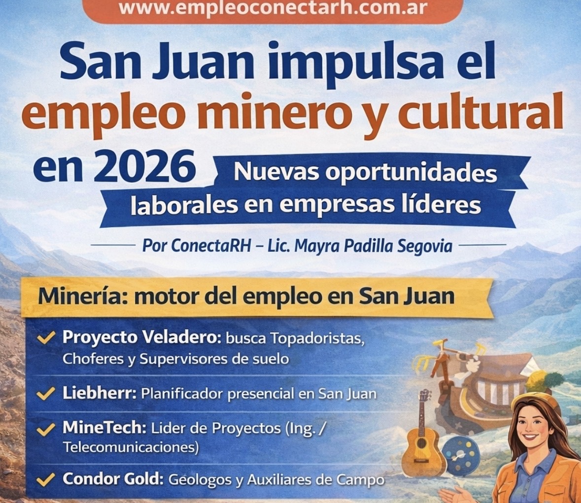 La provincia de San Juan continúa posicionándose como uno de los polos más dinámicos del empleo minero en Argentina. En 2026, el sector no solo mantiene su ritmo de crecimiento, sino que amplía su demanda de talento técnico, operativo y profesional. A este escenario se suma el sector cultural, generando una combinación estratégica entre desarrollo económico y fortalecimiento comunitario. Desde ConectaRH, acompañamos este proceso acercando información actualizada y orientación profesional para quienes desean insertarse o crecer en el mercado laboral sanjuanino. Minería en San Juan: el motor del empleo provincial El crecimiento sostenido de la actividad minera impulsa nuevas búsquedas laborales en empresas líderes del sector. Empresas que están contratando en San Juan Estas búsquedas reflejan una tendencia clara: la minería en San Juan no solo genera empleo operativo, sino también oportunidades técnicas y estratégicas de alto valor. Beneficios del empleo minero en San Juan Las propuestas actuales destacan por: El empleo minero en San Juan se consolida como una opción atractiva para perfiles técnicos, profesionales y operativos que buscan estabilidad y proyección. Cómo postularse a las vacantes Las empresas habilitaron canales oficiales de aplicación: Desde ConectaRH recomendamos postularse únicamente por medios oficiales y adaptar el CV según el perfil solicitado. Análisis profesional – Por Lic. Mayra Padilla (ConectaRH) Según la Mayra Padilla, directora de ConectaRH: “San Juan atraviesa un momento estratégico en materia de empleabilidad minera. La clave no está solo en la experiencia técnica, sino en las competencias blandas: compromiso, seguridad, adaptabilidad y trabajo en equipo. Quien entienda eso, tiene mayores posibilidades de avanzar en los procesos.” Desde ConectaRH observamos una profesionalización creciente en los procesos de selección, donde las empresas priorizan perfiles integrales y con formación continua. Conclusión – San Juan, presente y futuro del empleo minero argentino El 2026 confirma una tendencia clara: San Juan se consolida como uno de los principales polos de empleo minero y técnico del país, con impacto directo en la economía regional y en la generación de oportunidades reales. El desafío para los candidatos es prepararse estratégicamente: CV adaptado, certificaciones actualizadas y conocimiento del sector. Desde ConectaRH, continuaremos acercando información, análisis y asesoramiento profesional para potenciar la empleabilidad en minería y sectores estratégicos.