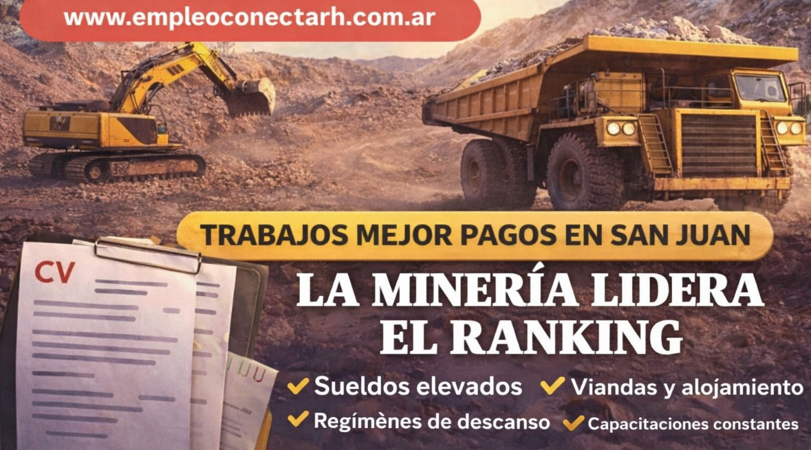 Por ConectaRH – Lic. Mayra Padilla Segovia | y Recursos Humanos San Juan se consolida como una de las provincias con mayores oportunidades laborales bien remuneradas del país. En ese escenario, hay un sector que se destaca claramente por encima del resto: la minería, motor de empleo, desarrollo productivo y estabilidad para miles de familias sanjuaninas. ⛏️ Minería: el sector con mejores salarios La actividad minera ofrece sueldos muy superiores al promedio provincial, empleo registrado, continuidad laboral y reales posibilidades de crecimiento. Hoy no solo se demandan operarios, sino también: ✔️ Técnicos✔️ Personal administrativo✔️ Choferes y transporte especializado✔️ Seguridad y control✔️ Mantenimiento, logística y servicios✔️ Profesionales en ingeniería, ambiente y gestión 🎁 Beneficios extras que marcan la diferencia Además del salario, muchas empresas mineras ofrecen paquetes de beneficios integrales, que elevan la calidad de vida de los trabajadores y sus familias: ✅ Viandas completas y alojamiento en campamentos✅ Traslados desde y hacia los puntos de trabajo✅ Regímenes de descanso programados (diagramas)✅ Capacitación constante y certificaciones laborales✅ Cobertura médica ampliada✅ Posibilidades de promoción interna y desarrollo de carrera Estos beneficios convierten a la minería en uno de los sectores más competitivos y estables del mercado laboral sanjuanino. 🔧 Otros rubros bien pagos en San Juan Si bien la minería lidera el ranking, también se destacan: ⚡ Energía y energías renovables🏗️ Construcción especializada🚛 Transporte pesado y logística🏭 Industria, mantenimiento técnico y servicios industriales 🌱 ¿Por qué apostar a la minería? Porque es un sector estratégico con visión a largo plazo, alta demanda de mano de obra calificada y fuerte inversión en formación. Desde ConectaRH sostenemos que un CV bien orientado al rubro y una preparación adecuada marcan la diferencia entre quedar fuera del proceso o acceder a una oportunidad real. ✅ Conclusión La minería no solo representa uno de los mejores salarios en San Juan, sino también estabilidad, proyección profesional y crecimiento sostenido. Apostar a este sector es apostar a un futuro laboral sólido, con capacitación constante y posibilidades reales de desarrollo personal y familiar. 👉 Si querés saber cómo armar tu CV para minería o qué puestos están buscando hoy, escribime.✨ Tu próximo trabajo puede estar más cerca de lo que pensás.
